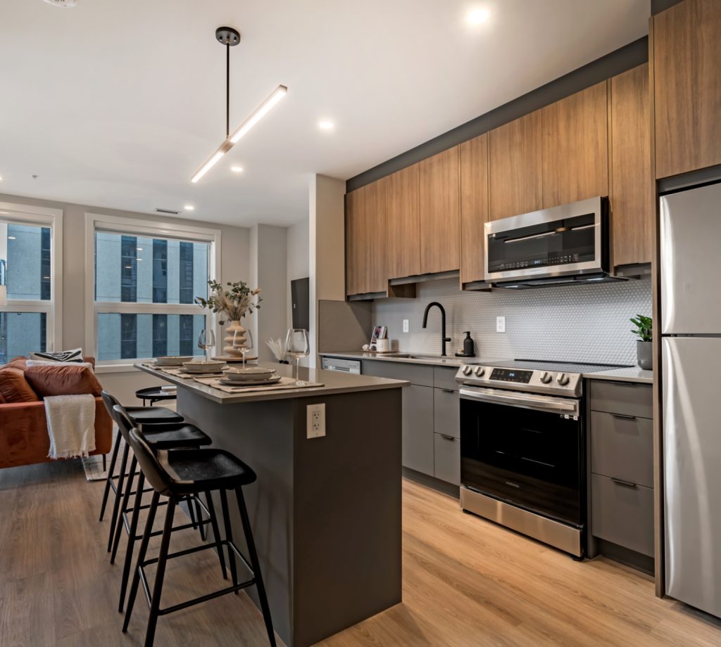 The upper floors feature 112 fully leased, modern two- and three-bedroom suites—delivering attainable luxury and a built-in community of long-term residents.